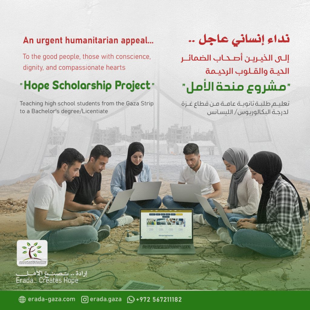 An urgent humanitarian appeal…To the good people, those with conscience, dignity, and compassionate hearts“ Hope Scholarship Project “Teaching high school students from the Gaza Strip – to a Bachelor’s degree/Licentiate